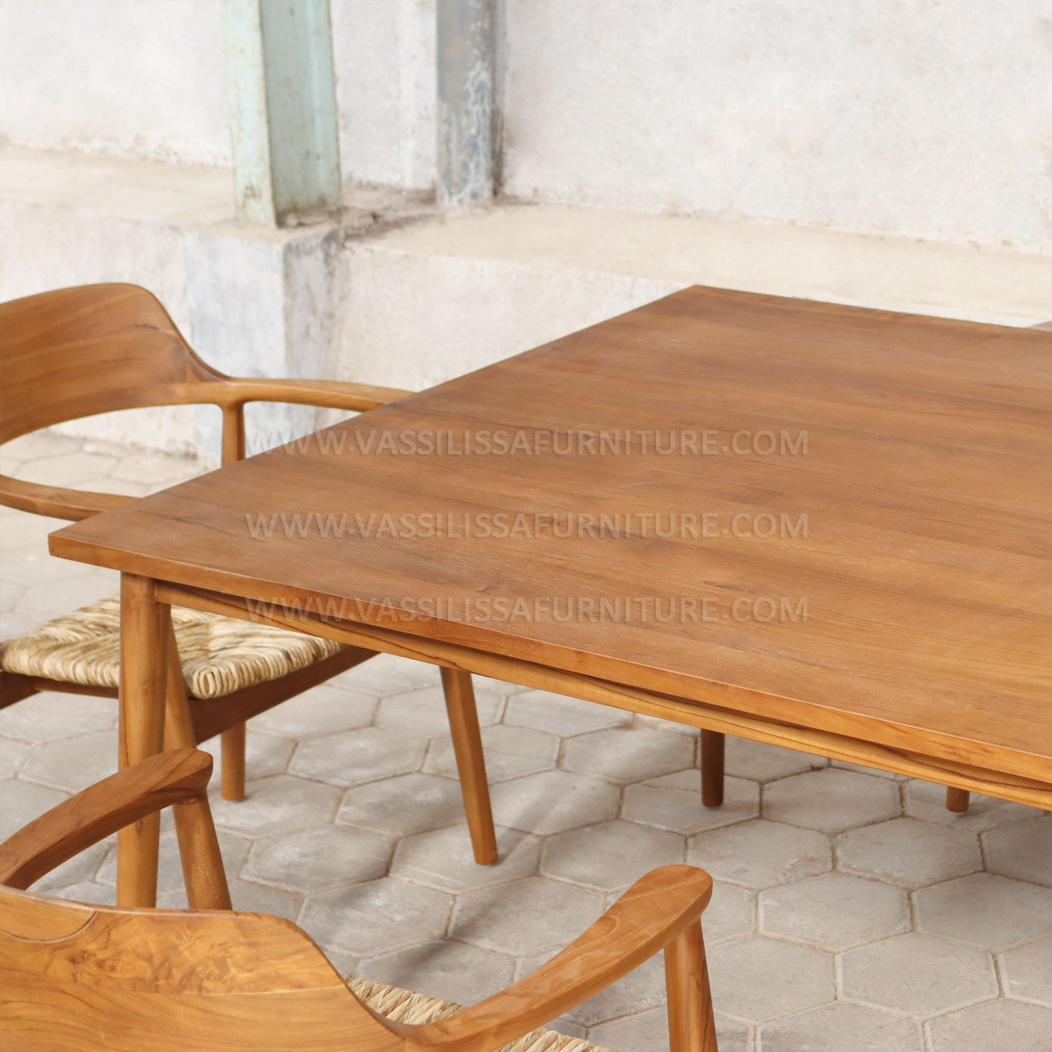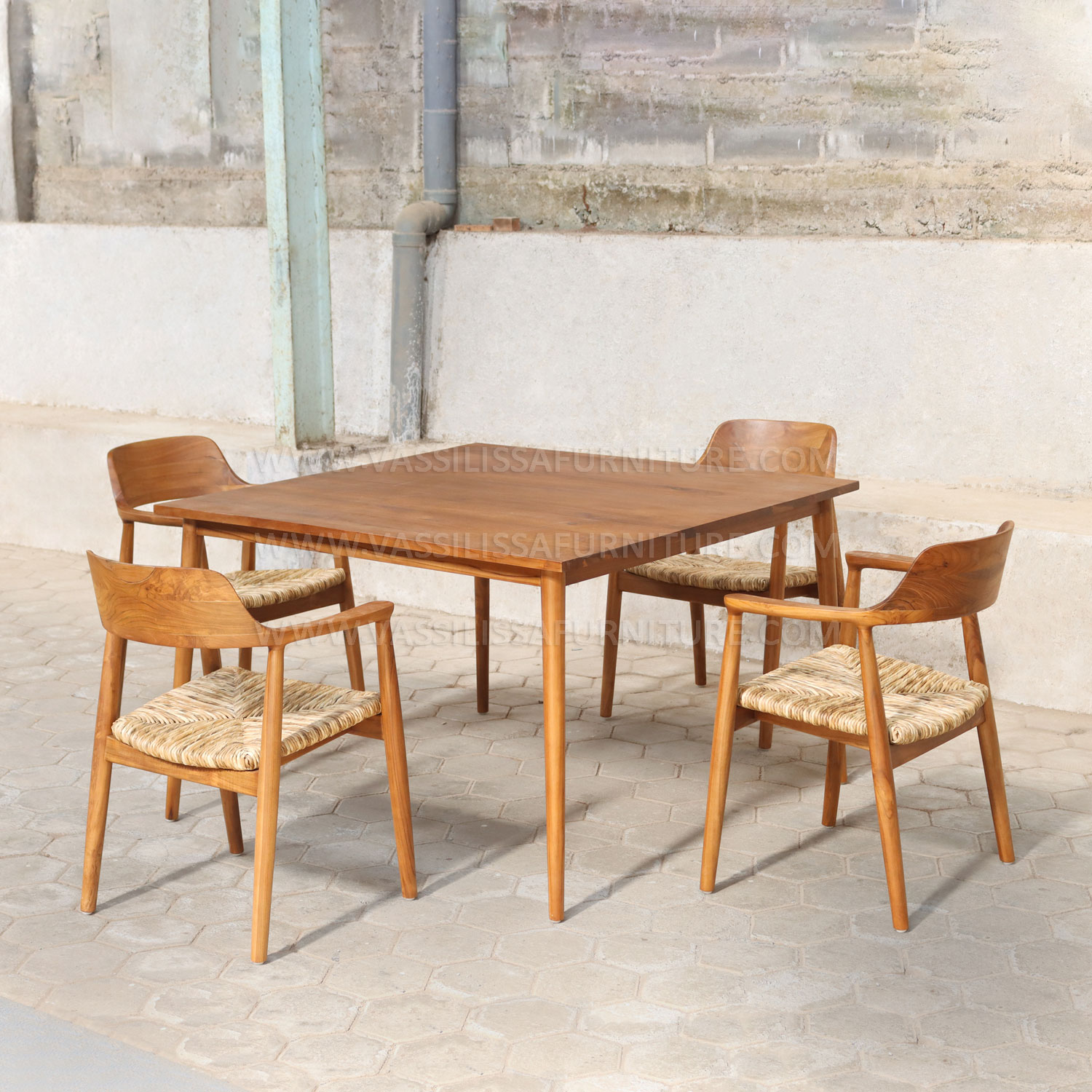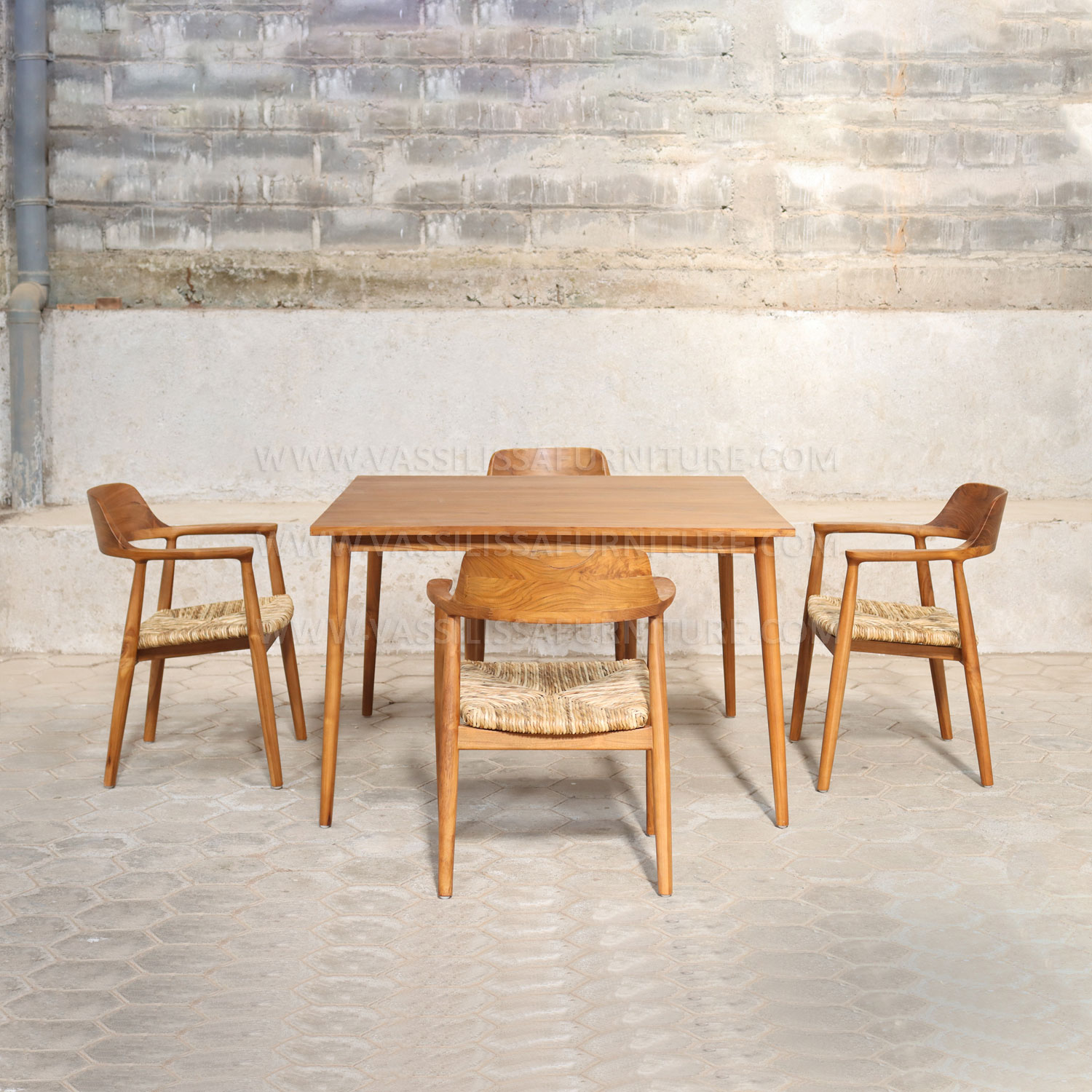 Tahiti Table Set is a Japandi and Scandinavian style dining set consisting of one table and four chairs, produced by an Indonesian furniture manufacturer. Each chair is crafted with a comfortable seat, ergonomic backrest and armrests to support a comfortable dining posture. The set features a beautiful and elegant wood pattern, emphasizing its minimalist design and functional purpose. With its sturdy form and balanced shape, this set is suitable for both contemporary and traditional interiors.